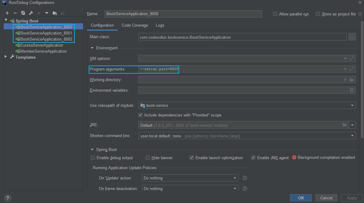 Edit Configurations,通过启动不同端口参数,模拟多个图书服务Book-service