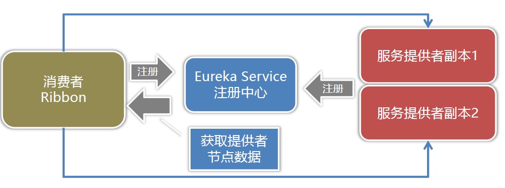Ribbon作为消费者微服务一端,也会向注册中心进行注册,注册中心Eureka service会向消费者Ribbon提供当前注册的所有节点数据(url、端口)信息。然后根据轮循(默认)策略请求服务提供者。